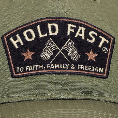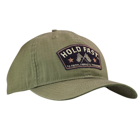 This rugged “Tactical Flags” Cap by HOLD FAST® in Olive will take pride of place in your casual wardrobe. Crafted of durable ripstop fabric with a low unstructured profile, the D-fit micro hook & loop closure with elastic band on this cap make it ideal for guys who need a larger size hat. The front displays an embroidered hook & loop patch featuring the words “HOLD FAST to Faith, Family & Freedom,” and a pair of U.S. flags.
