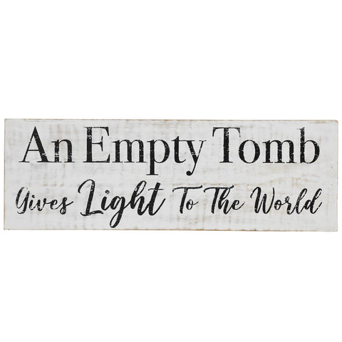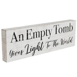 - Symbolic Design: Embrace the essence of Easter and spring decor with this symbolic 5x15-inch wooden sign from the Risen Collection, featuring "An Empty Tomb Gives Light To The World" in Nickel Grey against a Light Creme backdrop.