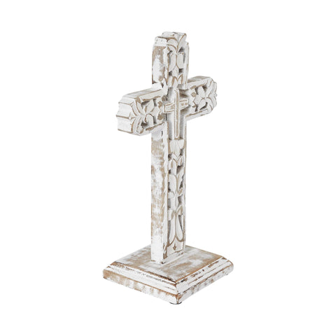 Enhance your home with a touch of serene spirituality using the Distressed White Ornate Wooden Cross with base. This decorative cross is beautifully crafted from tropical wood, known for its durability and distinctive light wood brown tone. It features an elaborate design with an inset cross at the center, surrounded by intricately carved swirls and floral motifs. The entire piece is painted in a distressed white finish, achieving a vintage look that complements both modern and traditional decor. This versatile piece can be displayed in any room, adding a meaningful touch to your living space. The cross's aesthetic draws from both farmhouse and country styles, making it an ideal addition to spaces designed with a rustic or shabby chic theme. The whitewashed finish not only highlights the detailed carvings but also enhances its spiritual symbolism, creating a peaceful ambiance wherever it is placed. Whether set against a busy backdrop in the living room, a tranquil corner of the bedroom, or welcoming guests in the entryway, this ornate wooden cross is sure to capture attention and spark conversations. Maintenance of this decorative cross is hassle-free, requiring only a soft cloth for cleaning to maintain its pristine condition. The solid base ensures stability, allowing for easy placement on any flat surface-from kitchen counters and dining room buffets to bathroom shelves. Measuring 13x7.5x5 inches, it is perfectly sized to make a significant impact without overwhelming the space. Make this Distressed White Ornate Wooden Cross a focal point in your home decor, and embrace its blend of artistic craftsmanship and spiritual elegance.