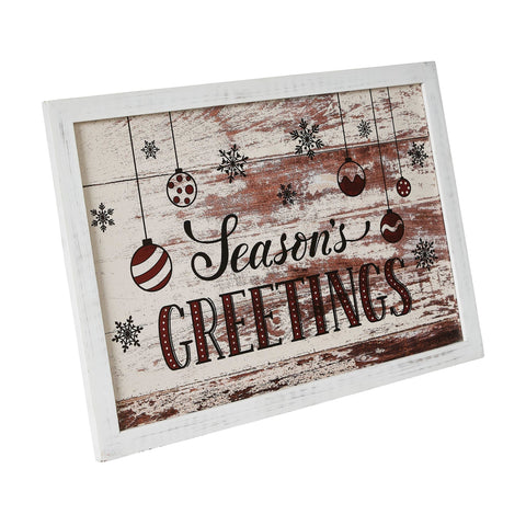 • Enhance your holiday decor with this charming wall hanging sign, measuring 11x16 inches, adorned with the festive message "Season's Greetings" accompanied by hanging ornaments and delicate snowflakes.
