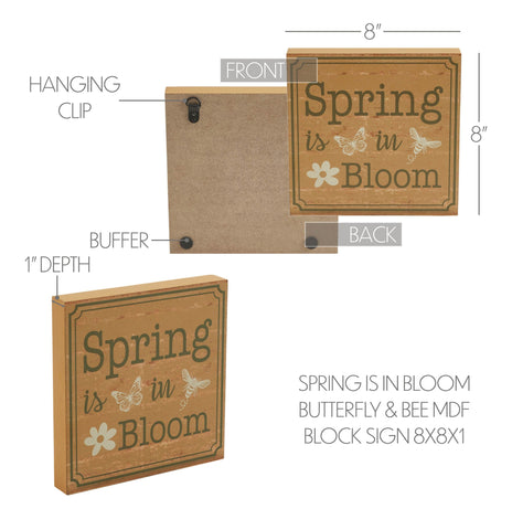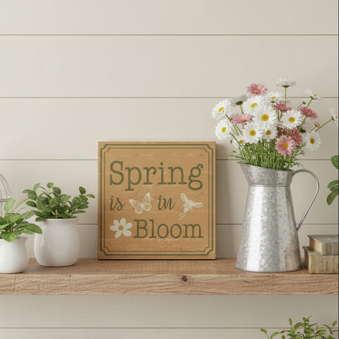 Celebrate the vibrant arrival of spring with the Spring Is In Bloom Block Sign. Measuring 8x8 inches, this charming sign features the cheerful phrase "Spring is in Bloom" in a rich moss green font. Accentuated by a delicate butterfly, a buzzing bee, and a blooming flower in faded creme, it creates a visually appealing contrast against the distressed golden tan base. Crafted from MDF, this square block sign embodies a farmhouse and country-inspired aesthetic, making it a versatile addition to any decor. The digital print highlights the intricate details of the spring-themed elements, while the distressed appearance adds a touch of rustic charm. The sign's elegant design and colors blend seamlessly with various interior styles, enhancing the welcoming atmosphere of your home.