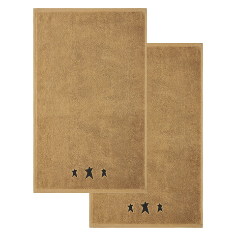 Add a rustic touch to your bathroom with the Black Prim Stars Tan Washcloths and Bath Towels. These soft and absorbent wash cloth and bath towels provide comfort and functionality for daily use. The neutral doe tan color offers a warm, inviting backdrop, while the embroidered design at the bottom showcases three primitive stars in rustic black, creating a classic, country-inspired accent. These are perfect for everyday tasks like face washing or adding a decorative element to a primitive-themed bathroom. The primitive star design enhances the rustic aesthetic of any washroom, making them a perfect fit for a farmhouse or country-style decor. Their soft yet durable texture ensures long-lasting quality and comfort, combining practicality with a timeless design. Machine washable for easy care. Whether you're refreshing your bathroom essentials or looking to add a decorative touch, these washcloths and bath towels provide the perfect blend of rustic charm and everyday convenience, making them a must-have for any primitive or country-inspired home.