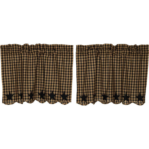 The Blackstone Farm Star Scalloped Tier Set features small scale black and khaki check base fabric with 5-Point stars appliqued along the bottom in solid black.