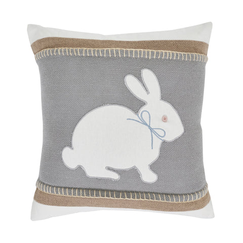 The Burlap Grey Applique Bunny Pillow 18x18 is crafted from creme canvas, featuring layers of cotton burlap. The bunny is appliqued in canvas and features bow embroidery and button eye. Includes button closures for easy access to the 100 percent polyester fill inside.