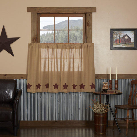Burlap w/Burgundy Stencil Stars Tier Set features natural burlap with a rod pocket that measures 3.25" in height which allows for a wide variety of hardware to be used.