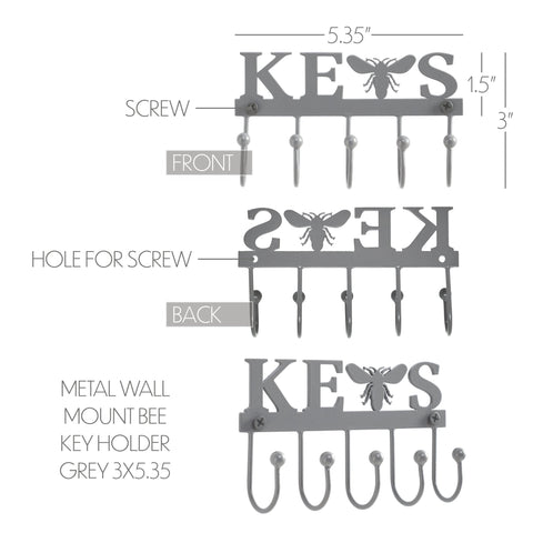 Enhance your home decor with the charming Buzzy Bees Metal Wall Mount Bee Key Holder, a perfect blend of functionality and style. Measuring 3x5.35 inches, this key holder features a unique design where the word "Keys" is creatively displayed, with a honey bee replacing the letter "y." The piece is crafted from durable metal in a vintage grey finish, giving it a distressed, farmhouse aesthetic that complements a variety of interior styles. This wall-mounted key holder is not just a practical solution for keeping your keys organized but also a delightful piece of spring decor. The honey bee detail adds a whimsical touch, making it a great addition to your entryway, kitchen, living room, or any other space where you want to infuse a bit of country charm. The solid color and distressed appearance blend seamlessly with rustic or country-themed interiors, making it an ideal choice for those who appreciate a touch of nostalgia in their home decor. Installation is straightforward, with all necessary hardware included in the packaging, ensuring you can easily mount it wherever you need.Â