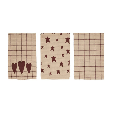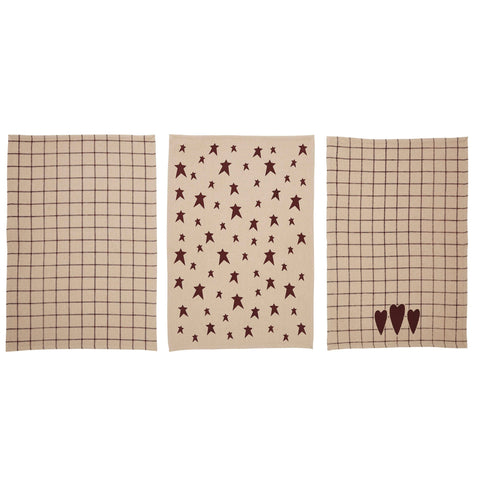 - Upgrade your kitchen decor with the Correll Collection Cotton Kitchen Towel set of 3 in a rich Burgundy hue. These Printed tea towels feature a Primitive and Country star pattern, adding a touch of rustic charm to your space.