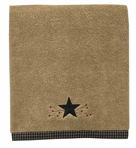 Embroidered Blackberry Star Bath Towels add a primitive touch to your country bath! Tan soft absorbent cotton terry towel with black star and burgundy pip vine. Terry has thick, tightly woven loops for better drying, greater durability and less tendency to snag. Made with soft, absorbent 100% cotton. Machine wash cold, tumble dry.