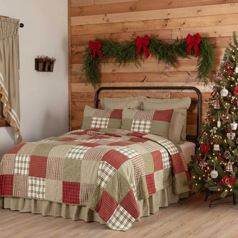 Traditional block patchwork is updated in our country casual Sage Winds Quilt. Featuring hand-quilting on various brick red, sage, and khaki block layout in plaid, striped, and ditsy fabrics offering a home-spun sophistication. Reverses to printed floral ditsy fabric.