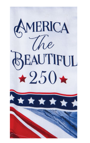Showing your true patriotic colors has never been more exciting, with this America The Beautiful Terry Towel. Dual purpose towels features 2-in-1 functionality with a flat weave front ideal for drying glassware, and absorbent terry cloth back side for everyday kitchen tasks!