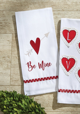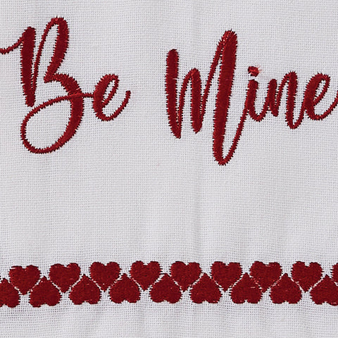 The embroidered Be Mine Towel adds a punch of Valentine's Day color to your farmhouse or country kitchen!  White and red cotton featuring an embroidered Be Mine with heart and arrow.