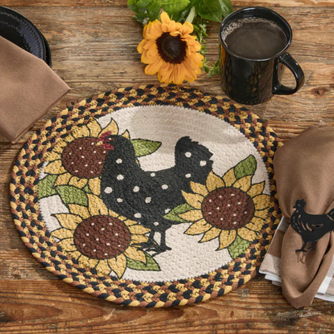 Adorn your table this season with our Sunflowers & Hen Round Braided Placemat Set of 4. The charming stenciled depiction of a black hen surrounded by sunflowers is the perfect way to add an autumn accent to your kitchen.