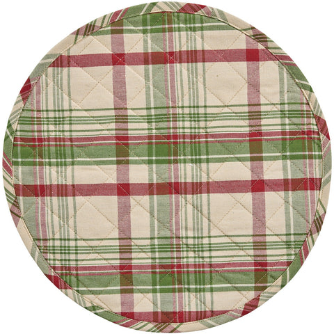 Add holiday elegance to your dining table with our Up On The Housetop Round Quilted Placemat Set of 4. The placemat features the colors of green, red and cream plaid cotton fabric.