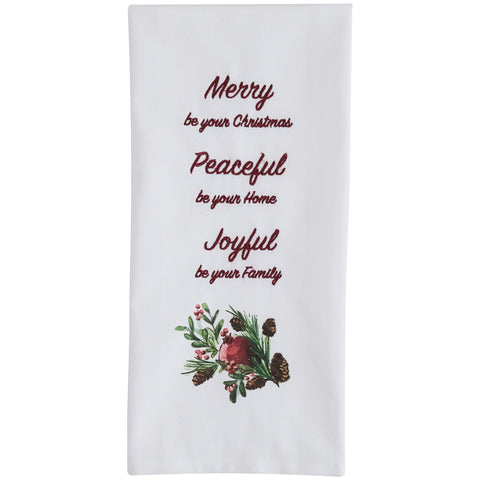 Welcome the Christmas season into your home with our embroidered Winter Country Decorative Dishtowels. Choose from 2 different christmas designs. The "Merry to your Christmas Peachful be your Home Joyful be your Family" or "All Roads Lead Home for the Holidays" phrases will add a charming touch to your home.