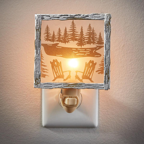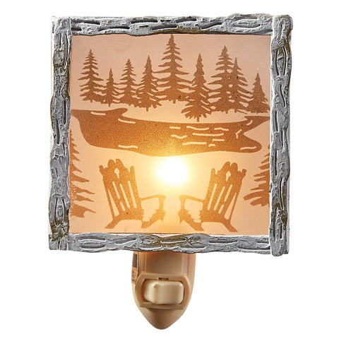 Rustic country charm awaits with our unique Adirondack Night Light. Made of sturdy cast metal frame with a serene evergreen lake scene with adirondack chairs motif. At night it softly illuminates with a warm glow that is ideal for entryway, stairs, kitchen, or bathroom.