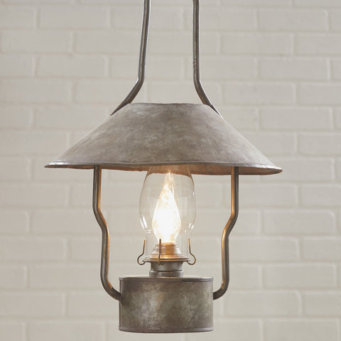 The Olde Mercantile Pendant Light takes it's rustic country galvanized design from the old general mercantile. Perfect for your primitive, farmhouse or country kitchen, bathroom or entryway. Galvanized. Includes glass globe. Must be hard-wired.