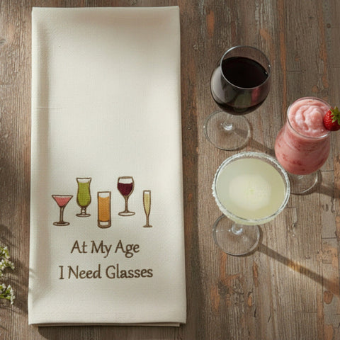 Raise a glass to kitchen humor with this witty embroidered dishtowel featuring the cheeky phrase "At My Age I Need Glasses." Perfect for wine lovers and cocktail enthusiasts, it brings a lighthearted touch to everyday tasks. Soft, absorbent, and conversation-starting, this playful kitchen essential doubles as a thoughtful gag gift for anyone who appreciates a good laugh with their libations.