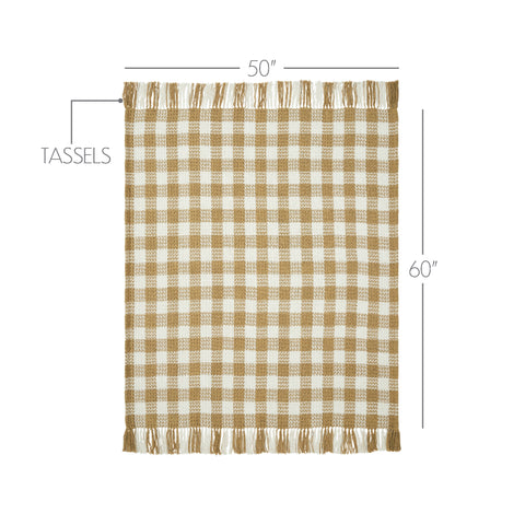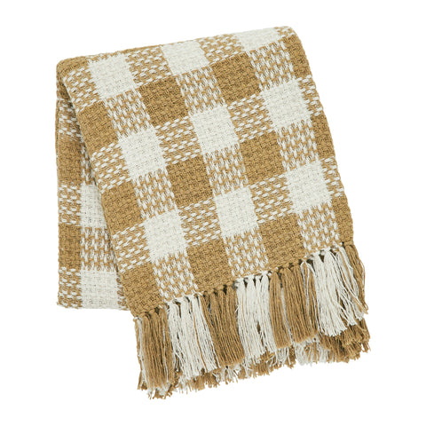 Whether draped over the back of chair or keeping you cozy, this classic plaid throw blanket will add a sophisticated style wherever it lands. Carrington Golden Wheat Woven Check Throw Blanket measures 50x60 inches and is constructed with a durable cotton polyester blend. Blending Golden Wheat and cream tones in a classic woven pattern with fringe, the tasseled throw blanket is perfect for holiday decor or year-round farmhouse style.