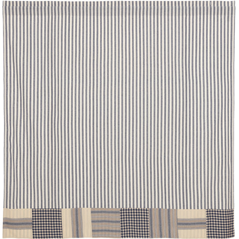 The Denim Market Block Border shower curtain features our popular blue ticking stripe, which keeps the look crisp and fresh. It is accented with three complementary fabrics framing the bottom edge. The textured, quilted squares include a gingham check, appliqued grain sack, and wide stripe in tan and blue.