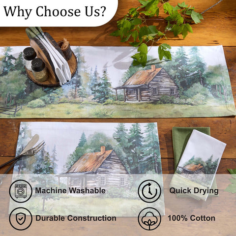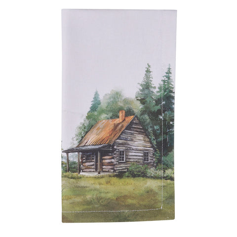 Transform any formal or casual dinner setting into a rustic seasonal paradise by incorporating this timeless, classic pattern from Secluded Cabin. The cabin design on this country cloth napkin effortlessly combines a color palette providing a versatile addition to year-round dining room decoration. Crafted from 100% high-quality cotton, this absorbent cloth napkin is reusable to offer a soft-to-the-touch luxurious feel and exceptional durability, making it perfect for both everyday use and special occasions. Effortlessly combines aesthetic appeal with functionality by offering an absorbent surface for an effective tool to clean up spills and messes during meals. Set of 4 Napkins.