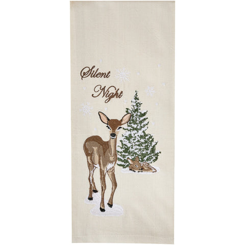 Welcome the Christmas season into your home with our embroidered Silent Night Deer dishtowel. Features a deer family in a wintry scene with the words "Silent Night".
