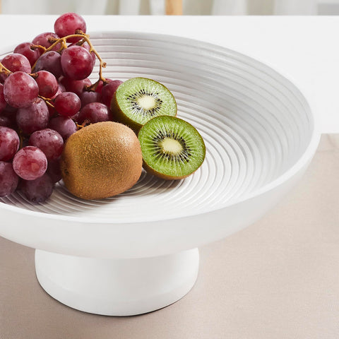 Enhance your home decor with the White Ribbed Wooden Fruit Bowl. Crafted from premium tropical wood, this 5.5x12x12 inch bowl features a shallow, ribbed design with an attached pedestal, making it a stunning centerpiece for any table, island, or counter. The soft white finish adds a touch of sophistication and versatility, seamlessly blending with farmhouse and country-inspired interiors. Its solid color and round shape make it a striking addition to your kitchen, dining room, entry, or living room. Designed for decorative use only, this wooden fruit bowl is perfect for displaying fruits, flowers, or other decorative items.