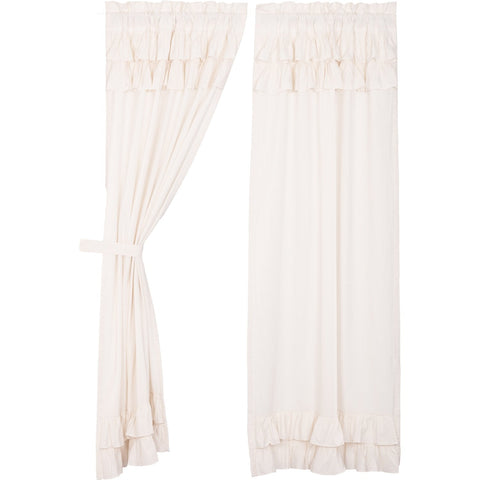 Hang our Simple Life Flax Antique White Ruffled Panel Set in your home to add a delicate, romantic look to your living space. Woven with cotton and linen flax, the sturdy, textured fabric paired with fanciful ruffles draws the eye. These curtains in antique white provide a cozy yet sophisticated touch to your farmhouse decor. Lined with white cotton, these elegant drapes help reduce sunlight and include tiebacks for days you prefer more natural light.