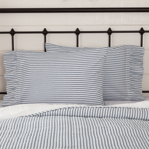 The Farmstead Blue Ticking Stripe Pillow Case Set of 2 completes the look of your bed with a classic, vintage feel. Featuring denim blue and soft white ticking stripes on beautifully textured cotton fabric, finished with a ruffle at the opening adding a touch of rustic romance. Coordinates well with the Farmstead Blue Ticking Stripe bedding.