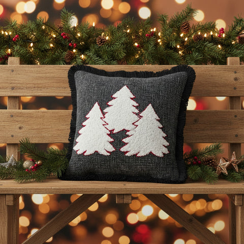 Add a little pop of festive style with this 3 Christmas Trees Black Woven Pillow. The 3 Christmas Trees Black Woven Pillow measures 12 by 12 inches and is intricately woven and delicately embroidered. The soft black, light creme, and candy cane red hues evoke the festive spirit of the season, creating a cozy atmosphere in any room. Whether placed in your bedroom, entryway, or living room, this Christmas Trees Black Woven Pillow adds a touch of farmhouse-inspired charm to your holiday decor.