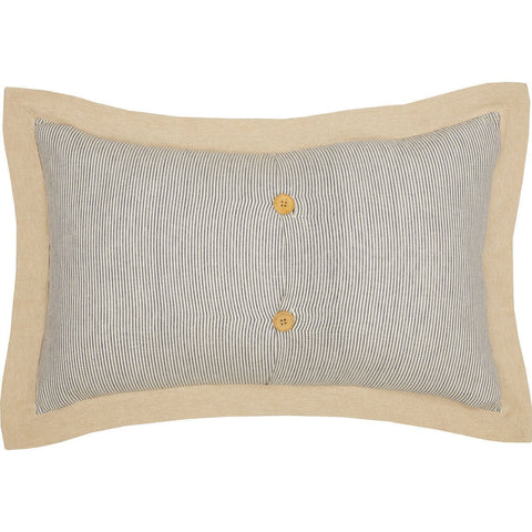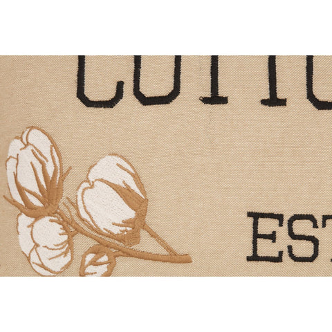The Ashlynn Cottton Mill Co. Pillow features embroidered cotton pods and the embroidered saying "Rinehart & Co. Cotton Mill". Reverses to soft blue and white stripe ticking.