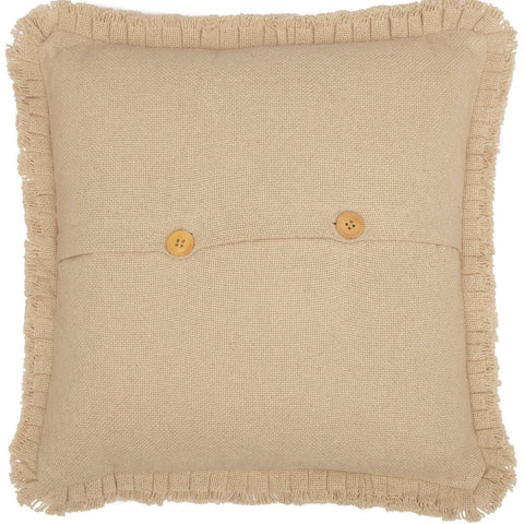 Add a neutral, elegant accent to your living room or bedroom with the Burlap Vintage Pillow w/ Fringed Ruffle. Made from our soft cotton burlap, this 18x18 unique throw pillow has both a fringe and a ruffle that creates vintage interest to an already classy pillow. Place this light beige accent pillow on a couch, bed, or chair anywhere in your home. The wooden buttons can be displayed at the front to create layered interest or use the solid side for cozy simplicity. Machine washable and iron safe. 100% cotton shell with a dyed polyester lining.