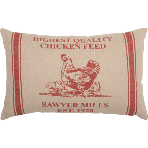 Complete the look of your farmhouse style home with the new Farmstead Red Hen and Chicks Pillow. This rustic, decorative pillow features a country red hen and chicks with vintage stripes on each end surrounded by farmhouse print, perfect for adorning your country style home furniture. Coordinates well with the Sawyer Mill Chicken Valance.