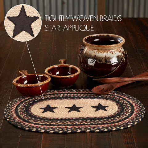 The Revere Jute Braided Placemat is perfect for your country, primitive or cabin table decor.  Rich ebony black, bright red, and natural tan jute accented with 5-point stars, add a rustic element and a neutral backdrop to offset your decor.    Sold individually.