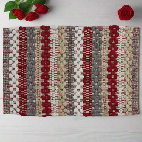 Our Farmhouse Holiday Chindi Placemats Set of 4 is a vintage country farmhouse or lodge addition to your table. Featuring a red, grey, tan and white weave, placemats add texture and color to your seasonal table.