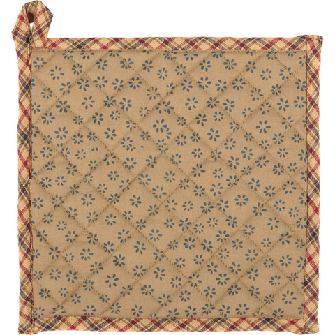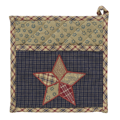 Bring a hint of primitive decor to the kitchen with the attractive, yet practical Country Blue Star Pot Holder. The appliqued 5-point star in barn red, tan, and navy plaid is eye-catching. The pot holder features a thermal cotton lining for safe handling of hot pans. 100% cotton batting. Reverses to khaki and country blue floral ditsy.