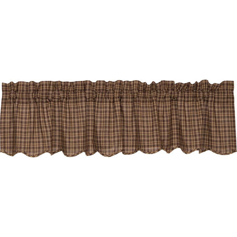 Create a stunning rustic look with the Preston Scalloped Valance. Showcasing an earth-toned brown, light tan, and creme plaid, this 16x72 curtain warms your living room, dining room, or kitchen decor with homespun polish and woodsy color. Machine washable and iron-safe, our soft valance has a white lining to help prevent the sun's glare and is crafted from 100% cotton.Â