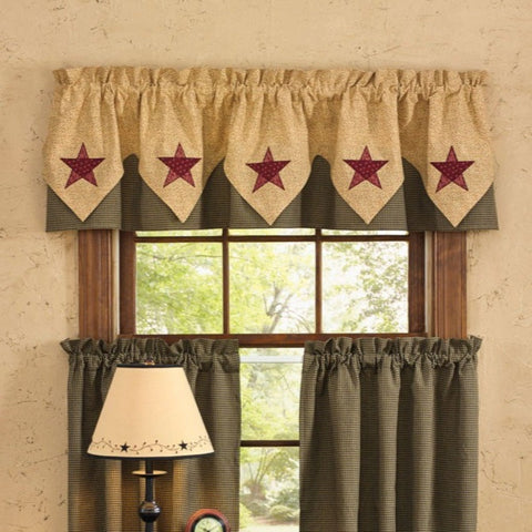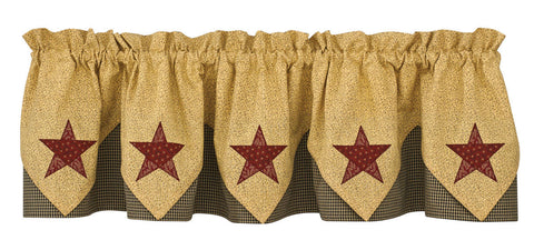 The Country Bandana Star Layered Point Valance tastefully combines layers of tan fabric and black and tan micro-check. Pointed edges with appliqued red patchwork stars create the perfect blend of farmhouse elegance and country charm. This vintage curtain is lined - 100% cotton.