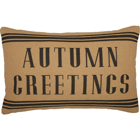 Welcome Autumn into your home with warm and cozy comfort. The Heirloom Farm Autumn Greetings Pillow presents a natural, earthy vibe featuring cotton burlap and the words "Autumn Greetings" covering the front surrounded by grain sack stripes in black. Reverses to natural cotton burlap with button closures. This seasonal throw pillow is the perfect accessory for a decorative chair or tossed on your bed to match your primitive decor.