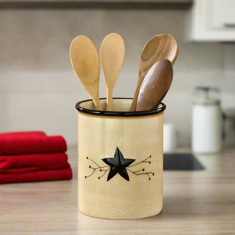 The Blackberry Crock is the ultimate farmhouse and primitive country accent. It's hand painted and combines a sponged ground with embossed star and vine details to create a classic look. The crock is so versatile and can be used to store kitchen gadgets, as a planter, or anywhere in your home.