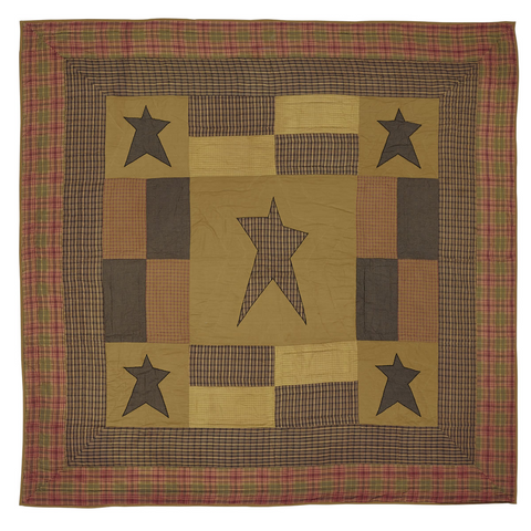 The Stratford Quilt displays a large primitive star in a country-inspired plaid set on a khaki ground. Enjoy the muted mustard, brown, green and red-orange. Smaller primitive stars and block frame are finished with hand quilting and a double border. Reverses to khaki.