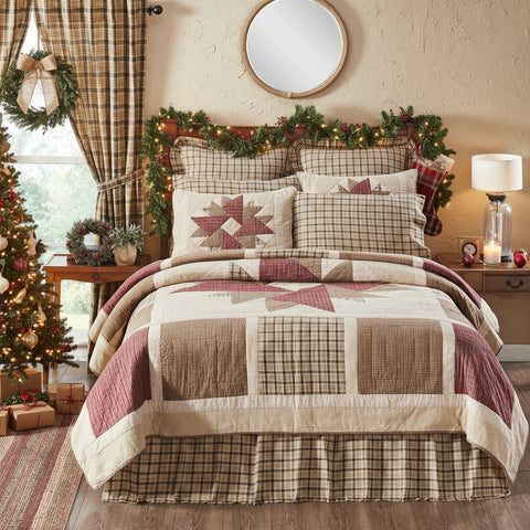 Enhance the look of your country bedroom with the Cider Spice Quilt. This quilt features a patchwork of red, green, and khaki for a classic primitive, country look. Contains stitch in the ditch and echo quilting that guarantees natural durability to wear and tear. 100% cotton batting spread throughout this country quilt ensures warmth and comfort for years to come. Reverses to a soothing plaid design for an additional decor option.
