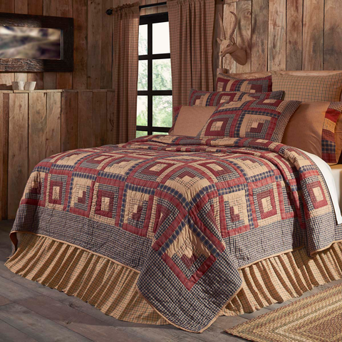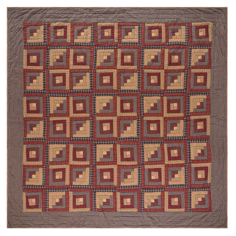 The Millbury Quilt features a country vintage log cabin patchwork design with contrasting colors of navy, burgundy, and tan, finished with a navy plaid border. 100% cotton and hand-quilting make this an heirloom quality quilt you will be proud to hand down.