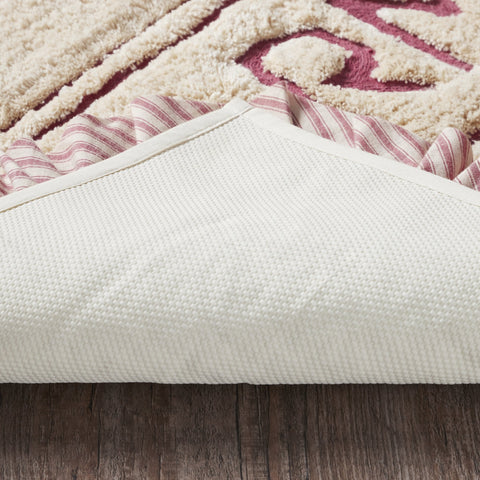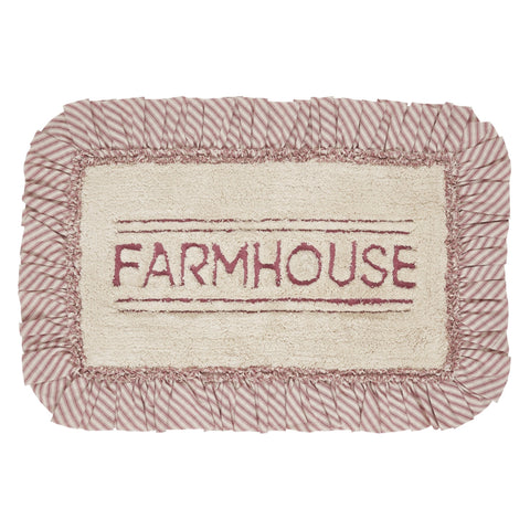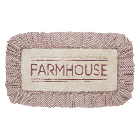 Add a farmhouse flair to your bath or living space with our Farmstead Red Farmhouse Bathroom Rug Mat. This beautiful dark creme and red comfortable mat with embroidered farmhouse text and red and dark creme ticking stripes coordinates with your country-themed decor. With a ruffled edge, ruched ruffle, and tufted weave, this bath mat will find a place in your home for years to come. Reverses to a solid tan rubber underside to prevent slippage.