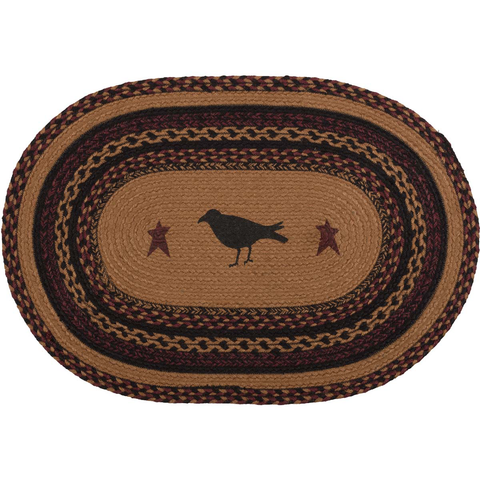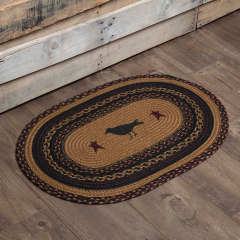 The Heirloom Farm Crow Jute Rug Oval lifts its colors from the bedding set to complete a quietly primitive look throughout the entire house. Crow stenciling between primitive stars adds a homey flair to this rug. Reverses to latex spray backing to help prevent slippage.