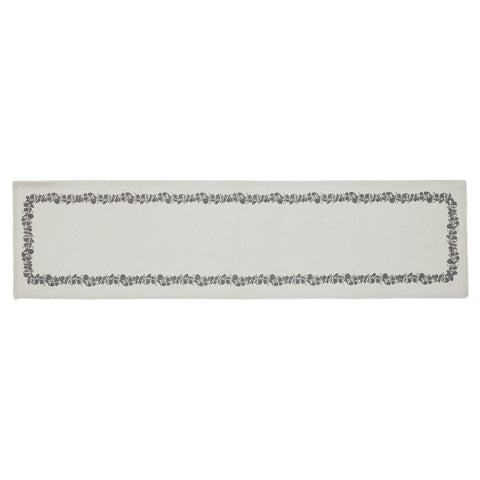 - Enhance your dining room or kitchen with the charming Serene Haven Collection table runner in Soft White and grey.