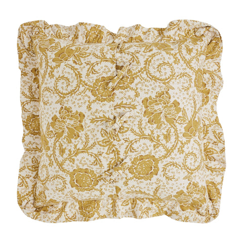 Instantly transform your home with the 26x26 Dorsey Gold Floral Fabric Euro Sham. A rich and beautiful golden color in a floral design adds a farmhouse element to your country setting while complementing your decor. The double layering, ruffled edge, and unique tie closures complete the look for a classic farmhouse decor approach with a touch of country appeal.