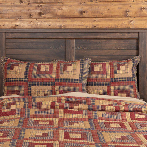 The Millbury Sham features log cabin blocks in burgundy, rust, navy and tan flanked with navy check fabric. 100% cotton batting.  Reverses to tan with navy flecks fabric. 3" overlap to conceal pillow insert.