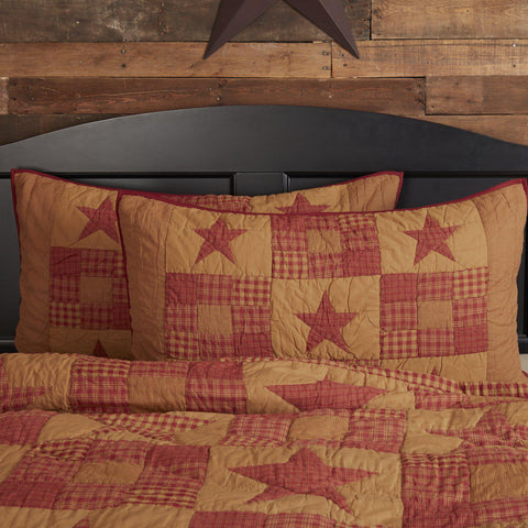 The Bedford Burgundy Standard and King Shams feature large ninepatch blocks alternate with 5-point stars flanked with khaki and burgundy fabric.