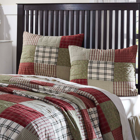 The Sage Winds Sham brings the traditional brick red, sage, and khaki block patchwork of the quilt to a smaller size. It's block layout in plaid, striped, and ditsy fabrics offers home-spun sophistication. Reverses to ditsy printed floral fabric with 3 dark wooden closures.