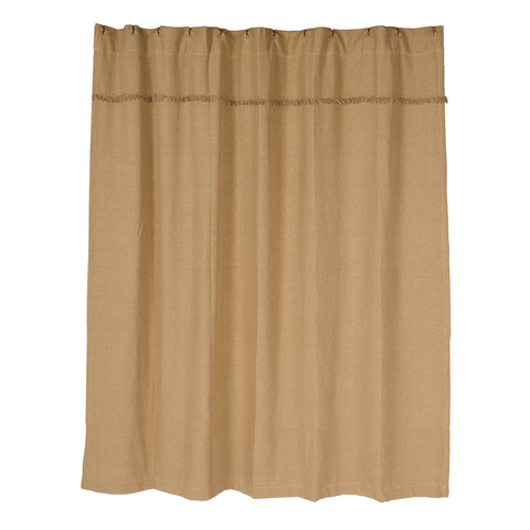 The Burlap Natural Shower Curtain is a perfect fit for almost any bath with its graceful drape, all-cotton construction, and solid tan color.   The burlap fringe adds a decorative touch at the top.